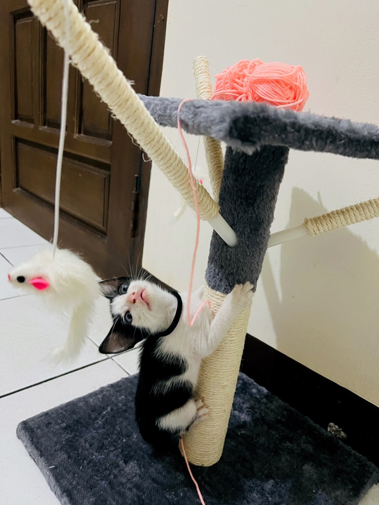 There is no question, our home life has become a lot more exciting with Pickle around. Yes, it hasn’t been that easy adjusting to a new routine and taking on more responsibilities, but the joy he brings is priceless. It has been an adventure shopping for supplies, cat-proofing our home, setting up play areas, going to the vet, and just overall getting to know the new member of our family. Since joining our little unit, Pickle has blossomed into a delightful little kitten. His personality and skills are developing by the day. Aside from being brave, he is also curious and playful, affectionate and loooves the attention. He enjoys different types of play (additional workout for me) and has picked his favorite foods.